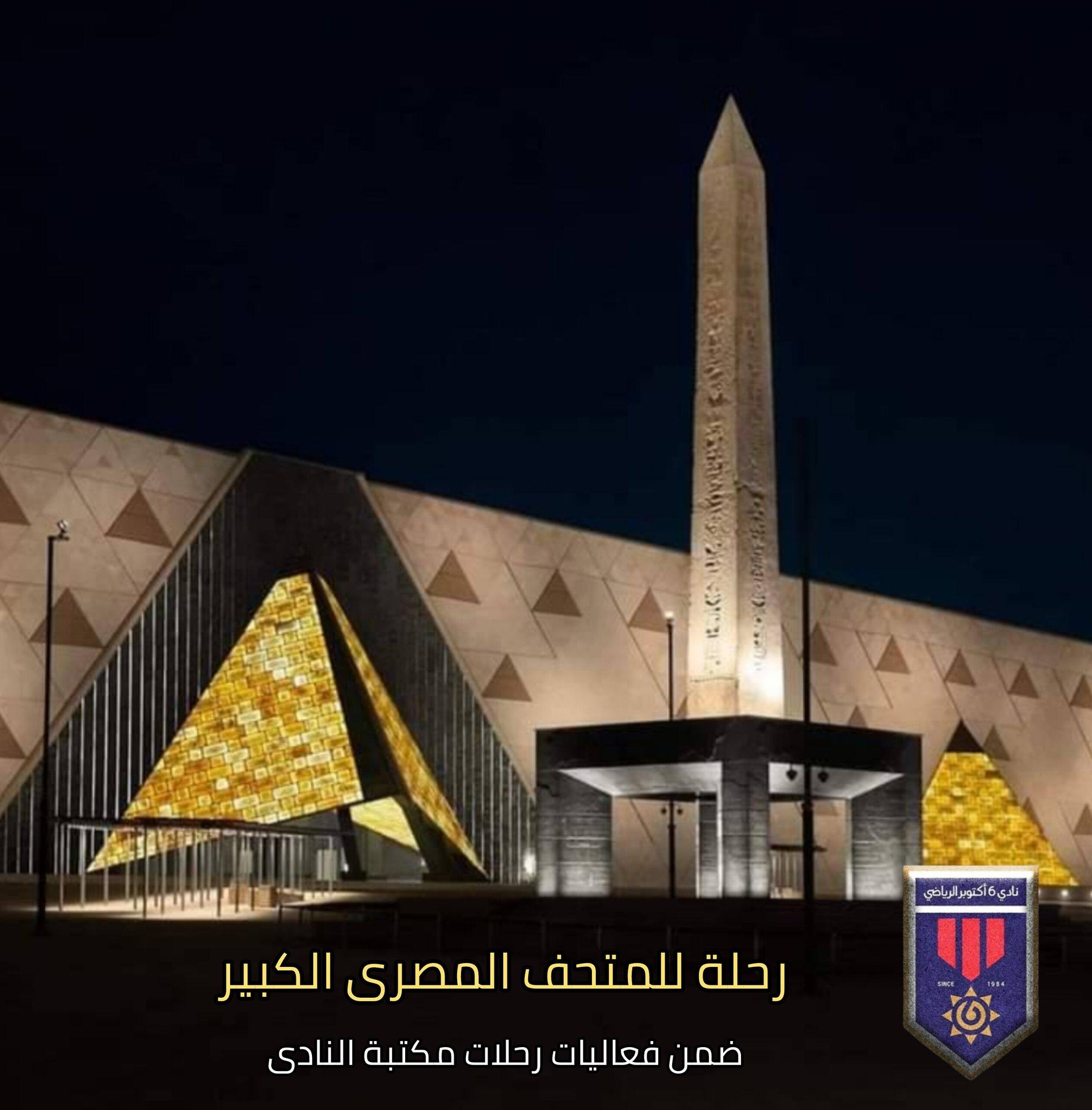 إقامة رحلة للمتحف المصرى الكبير تحت إشراف مكتبة النادي وذلك يوم الجمعة 14 نوفمبر 2025 للحجز و الاستعلام مكتبة النادي أعلي المبني الاجتماعي تفاصيل_الرحلة السادة الأعضاء بالنسبة لكل ماهو طالب ضروري إحضار ما يثبت سواء كارنيه المدرسة أو خلافه أثناء الرحلة أو عند الحجز بالمكتبة وكبار السن ضروري وجود بطاقة الرقم القومي نتمني قضاء وقت ممتع للسيدات والسادة الأعضاء الكرام