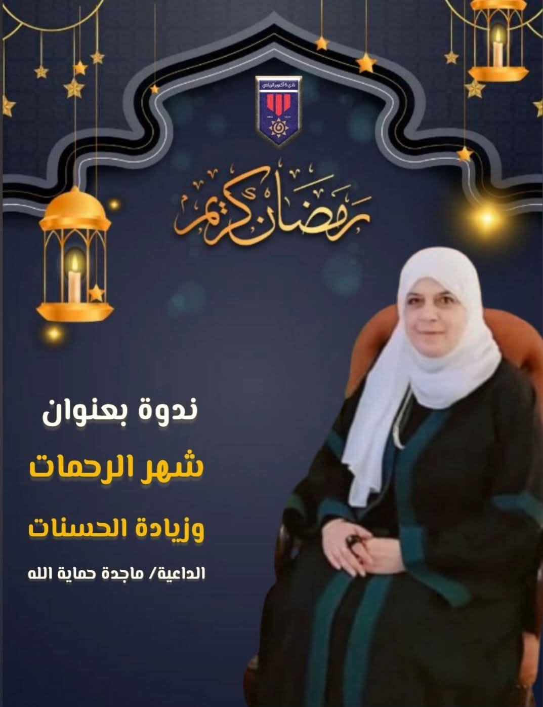 شهر الرحمات وزيادة الحسنات الداعية/ ماجدة حماية الله وذلك يوم السبت 28 فبراير 2026 بقاعة المناسبات بعد صلاة التراويح بالتعاون مع لجنة المرأة ندوة بعنوان