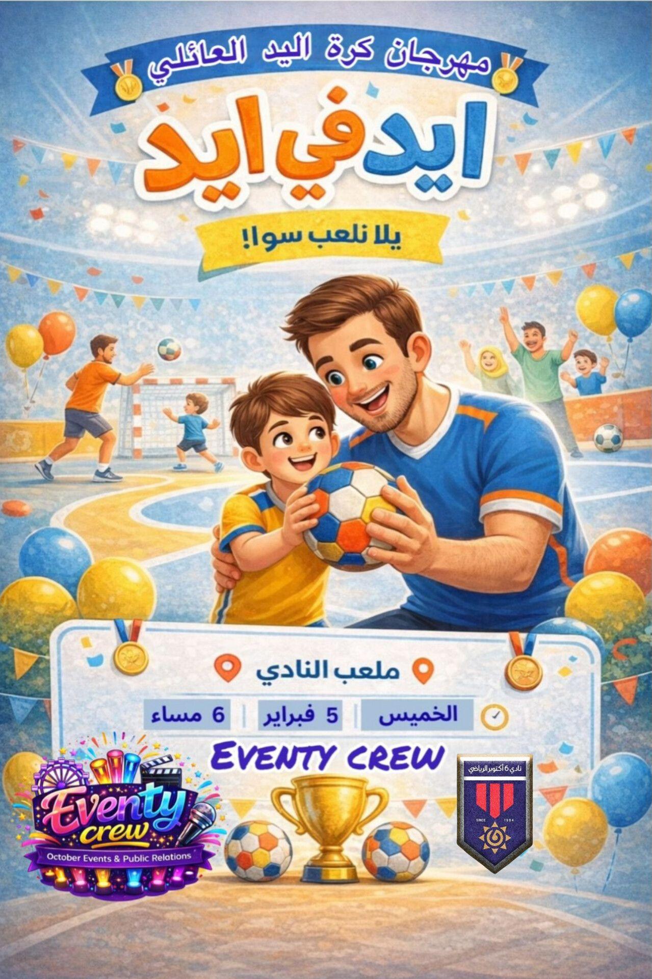 ماتش العيلة👨👧🤾♂️ بابــــا و مامـــا والأولاد فـــي الملعـــــب مسابقــــة كرة يـــد خفيفة ولطيفة بيـن العيلة ويوم مليان طاقة من ♥️ Eventy crew ♥️ بالتعاون مع لجنة الشباب✨ وبالتعاون مع لجنة كرة اليد ✨️ ضحك • لعب • روح رياضية تجمع العيلة كلها • ذكريات حلوة مع ولادكم 💙 هنعمل مهرجان عائلي لرياضة كرة اليد 🤾♀️🤾 🧔♂️بابا يشارك 👩🦰ماما تشارك والكسبان الحقيقي؟ العيلة كلها 📍 ملعب نادي 6 أكتوبر 📅 الخميس 5 فبراير ⏰ بداية التسجيل الساعة 6 مساءا 🎁 جوائز وميداليات للمشاركين و مفاجأت تنافسية مميزة 📣 المشاركة مفتوحة لجميع الآباء والأمهات مع أبنائهم تعالوا نلعب, نتحرك, و نعيش يوم مختلف و مليان حماس مع Eventy crew💪🏻 بالتعــــاون مع لجنـــة تنظيم الإيڤنــتات والعلاقات العامة