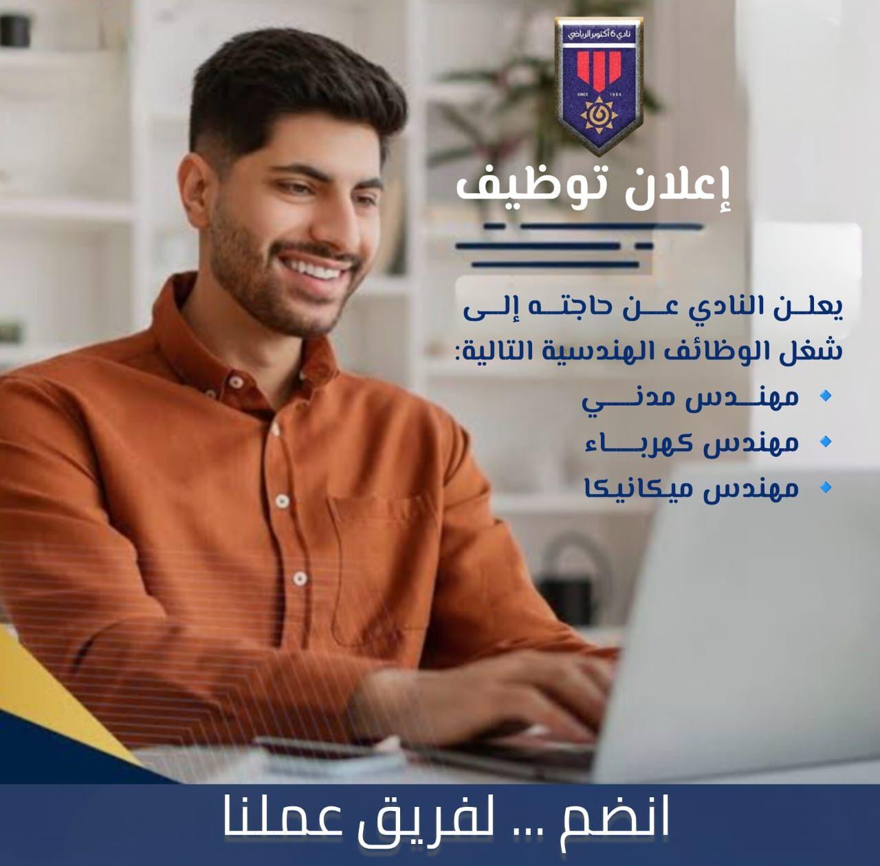 #إعلان_توظيف 📢 يعلن نادي مدينة 6 أكتوبر الرياضى عن حاجته إلى شغل الوظائف الهندسية التالية: 🔹 مهندس مدني 🔹 مهندس كهرباء 🔹 مهندس ميكانيكا #الشروط_العامة: ✔ خبرة لا تقل عن 5 سنوات في مجال الإنشاءات والصيانة ✔ إجادة استخدام البرامج الهندسية المتخصصة ✔ القدرة على العمل ضمن فريق عمل متكامل ✔ القدرة على إعداد حصر بالكميات والخامات المطلوبة ✔ إعداد خطط المتطلبات الشهرية والسنوية #طريقة_التقديم: 📩 يرجى إرسال السيرة الذاتية (C.V) إلى مكتب سكرتارية مجلس الإدارة #خلال_الفترة_من: 📅 الثلاثاء 7 أبريل 2026 إلى الجمعة 10 أبريل 2026