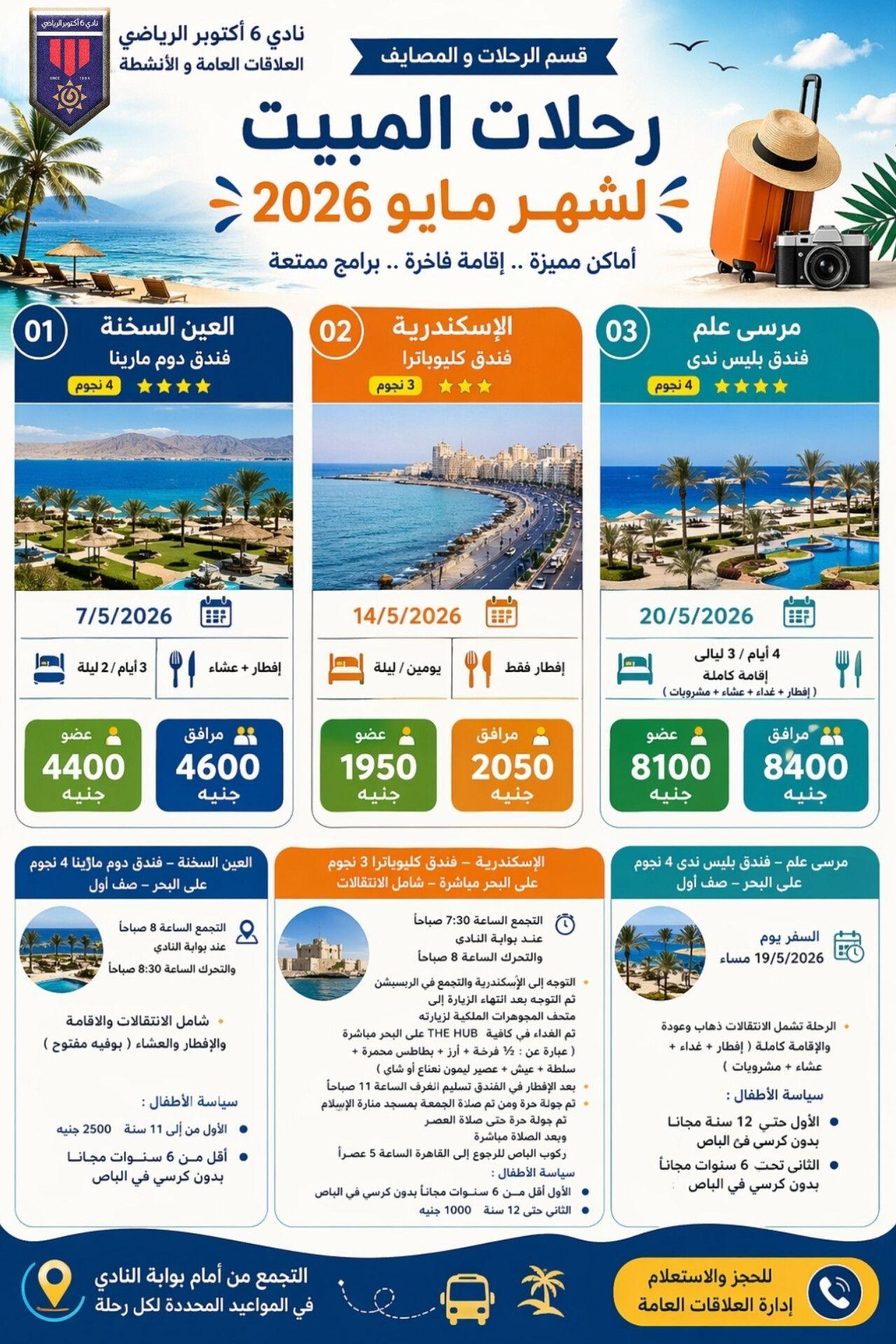#رحلات_شهر_مايو 2026 🏖️🌊🏝️☀️ يسعدنا أن نقدم لكم برنامج رحلات مميز يجمع بين التاريخ الترفيه والاستجمام… استمتعوا معنا بأجمل الرحلات #رحلة شارع المعز📍 جولة في قلب القاهرة الفاطمية لاكتشاف عبق التاريخ وزيارة المعالم الأثرية والتقاط أجمل الصور وسط أجواء تراثية فريدة #رحلة متحف الحضارة🏛️ زيارة مميزة لأحد أهم متاحف مصر الحديثة والتعرف على تاريخ الحضارة المصرية عبر العصور، مع تجربة مشاهدة قاعة المومياوات الملكية . #رحلة السويس 🌊 يوم ترفيهي على شاطئ البحر للاستمتاع بالهواء النقي والأجواء الهادئة بعيدًا عن صخب المدينة #رحلة الإسكندرية 🏖️ عروس البحر الأبيض المتوسط في انتظاركم… جولة تشمل أبرز معالمها مع وقت حر للاستمتاع بالكورنيش والبحر #رحلة القناطر الخيرية🌿 قضاء يوم وسط الطبيعة الخلابة والمساحات الخضراء، مثالية للاسترخاء وقضاء وقت عائلي مميز #رحلة بورسعيد ⚓ رحلة إلى المدينة الباسلة، تجمع بين التسوق والمتعة، مع جولة في أشهر معالمها والاستمتاع بأجوائها الخاصة. #رحلة شارع المعز الجنوبي📍 استكمال لجمال القاهرة التاريخية، بجولة في الجزء الجنوبي بما يحمله من آثار وحكايات مميزة. 🏝️ رحلة الساحل الشمالي استمتعوا بأجمل الشواطئ والرمال البيضاء والمياه الصافية… يوم من الرفاهية والاستجمام في أرقى الوجهات. 🎯 معانا هتعيشوا تجربة مختلفة… تنظيم متميز – أماكن مختارة بعناية – وأجواء لا تُنسى سارعوا بالحجز… الأماكن محدودة لمعرفة كافة التفاصيل والحجز برجاء الضغط علي اللينك المرفق 👇🏻 👇🏻 👇🏻 https://drive.google.com/.../11v2Hc7i.../view...