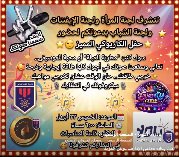 عن دعوتكم لحضور حفل الكاريوكي وذلك بقاعة المناسبات بالمبنى الاجتماعي 📅 يوم الخميس الموافق 23/4 🕕 الساعة السادسة مساءً 🎤 في أجواء من البهجة والمرح، ننتظركم لقضاء أمسية مميزة مليئة بالغناء والتفاعل مع أطيب تمنياتنا لكم بقضاء وقت ممتع بالتعاون مع لجنة المرأة ♥️ ولجنة الإيفنتات ولجنة الشباب