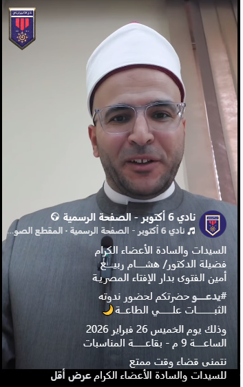 قراءة المزيدالسيدات والسادة الأعضاء الكرام فضيلة الدكتور/ هشـــــام ربيــــع أمين الفتوى بدار الإفتاء المصريـة #يدعـــــو حضرتكم لحضور ندوته الثبــــــــــات علـــــــي الطاعـــة🌙 وذلك يوم الخميس 26 فبراير 2026 الساعـــــة 9 م - بقاعـــــــة المناسبات