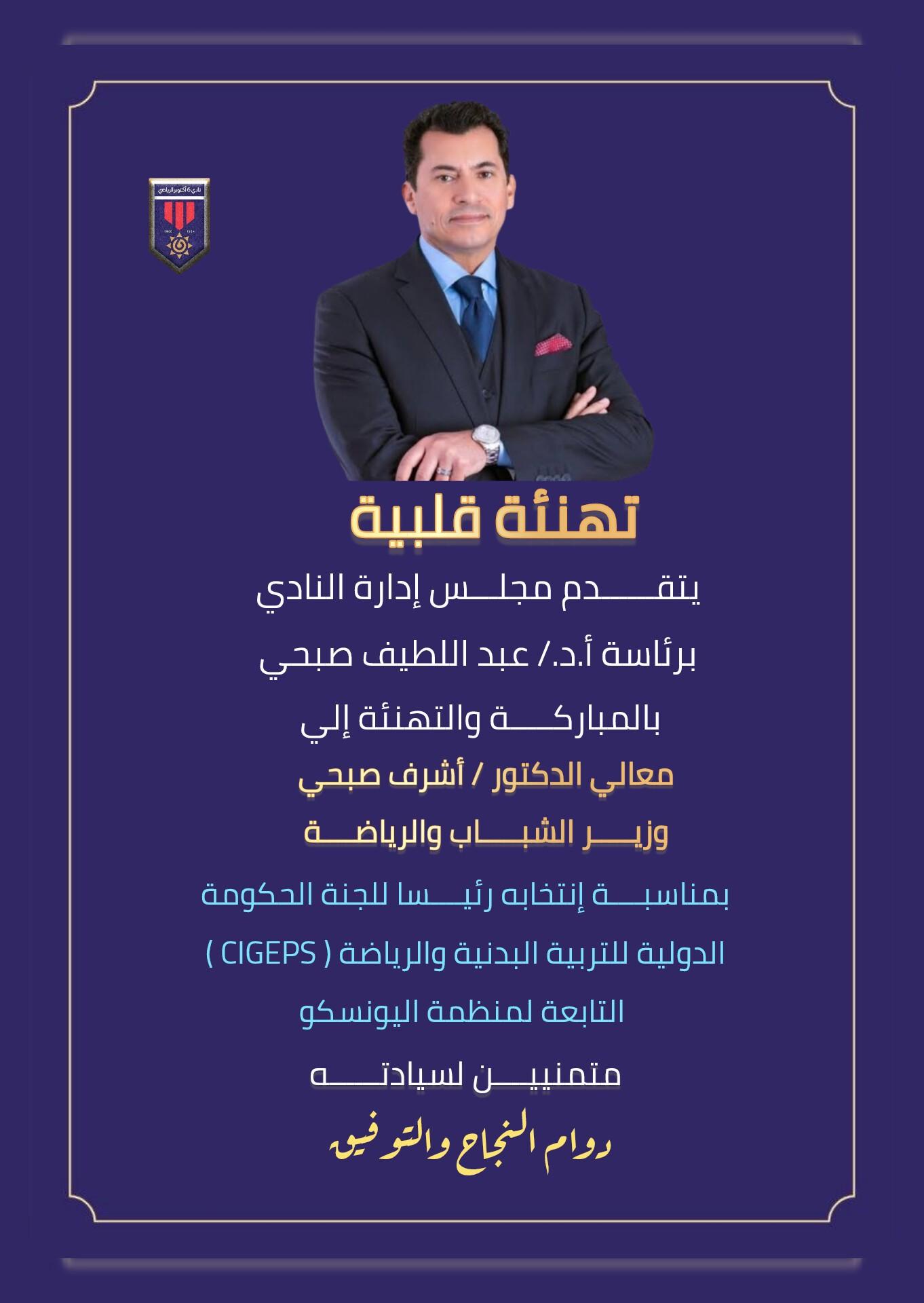 يتقدم مجلس ادارة النادي برئاسةأ.د/ عبد اللطيف صبحي بالمباركة والتهنئة الى معالي الدكتور /اشرف صبحي وزير الشاب والرياضة بمناسبة انتخابه رئيساً للجنة الحكومه الدولية للتربية البدنية والرياضية التابعة لمنظمة اليونسكو متمنيين لسيادته دوام النجاح والتوفيق