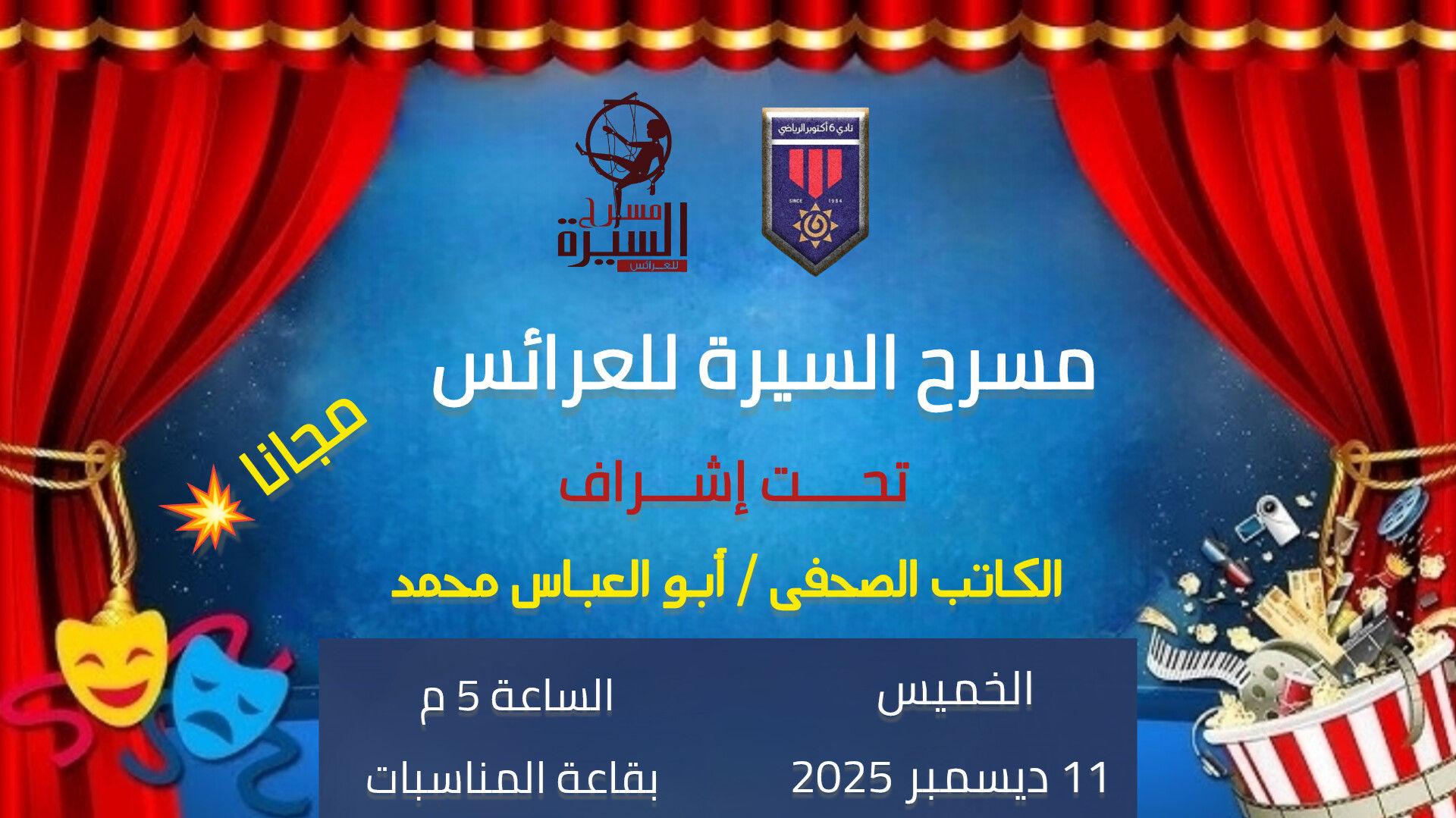 تعلــــــن إدارة العلاقـــــات العامـــــة في إطار التعاون بين نادي 6 أكتوبر ومســــــرح السيـــــــرة للعرائــــــس تحـــت إشراف الكاتـــب الصحفــــي أبو العباس محمد بدعوة السيدات والسادة الأعضاء الكرام لحضــــــور عــــرض الليلــــة الكبيــــرة علي مسرح السيرة للعرائس وذلك يوم الخميس 11 ديسمبر 2025 الساعة الخامسة مساء بقاعة المناسبات بالمبني الاجتماعي والحضور #مجانــــا