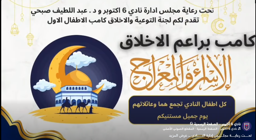 احتفال كامب براعم الأخلاق بليلة الاسراء والمعراج بالتعــــــاون مــــــــــــع لجنــــة القيـــم والأخـــــلاق وذلك يوم الجمعة 16 يناير 2026 بعد صلاة العصر بالتراس الجديد #التفاصيل_الاحتفالية براعم الأخلاق وأسرهم يجمعوا يوم الجمعة ليلة الاسراء والمعراج وقت رائع مع قصه الاسراء والمعراج مسابقات وهدايا للصلاة وأول مرة بمدينه 6 أكتوبر كاريوكي إنشاد ديني إلي صوته حلو في القرأن والانشاد حنرشحه لدورة التلاه كونوا علي الموعد لنشحن بطاريات القلوب بعطر ورياحين الإيمان في ليلة مباركة بعد صلاة العصر منطقة التراس الجديد