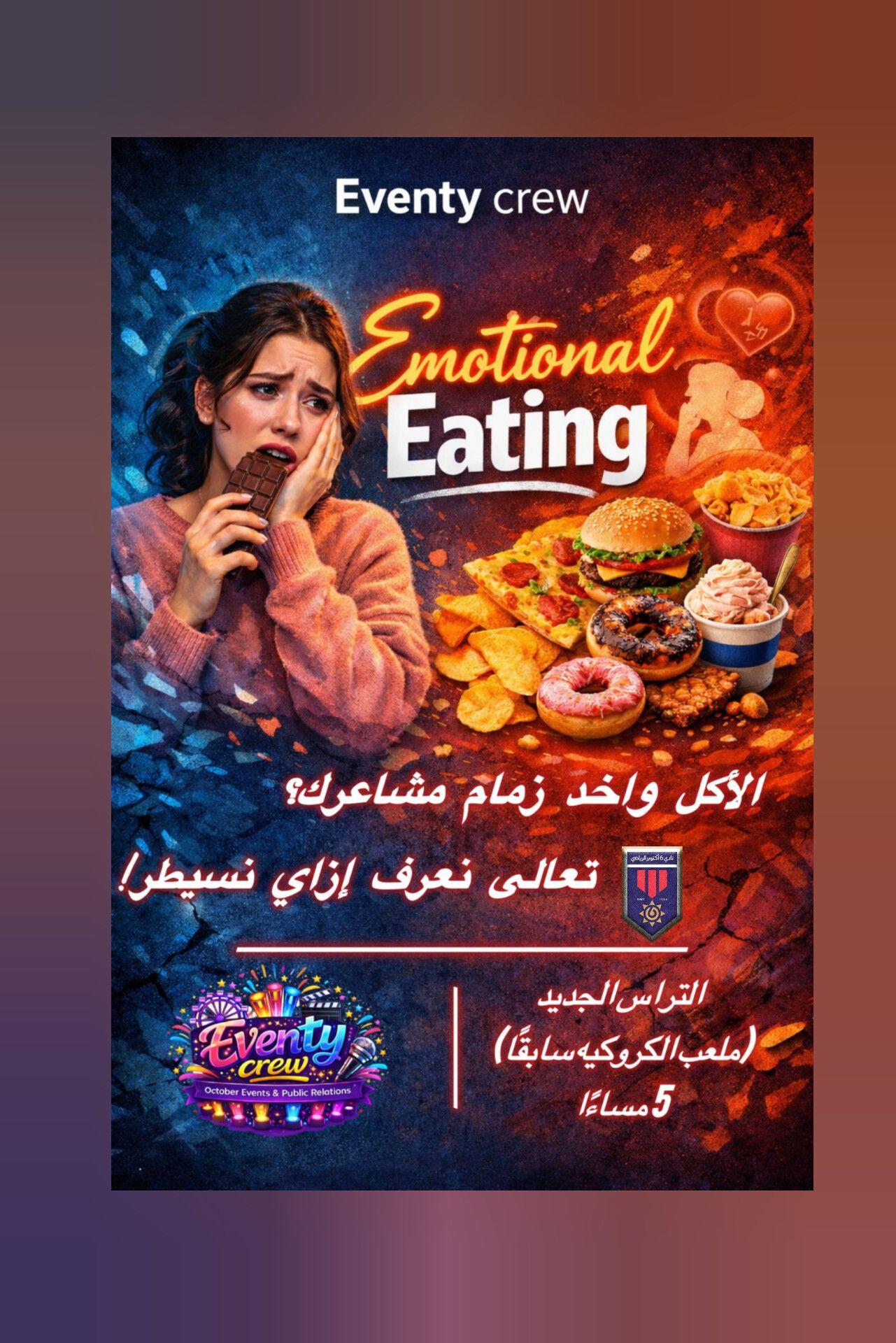 Eventy Crew 📅 السبت 7 فبراير 2026 🕔 الساعة 5 مساءً 📍 التراس الجديد – ملعب الكروكيه سابقًا #تفاصيل_الايفنت مش كل جوع بيكون جوع أكل… أوقات كتير بيكون جوع لمشاعر محتاجة نفهمها 💭 لو بتلاقي نفسك بتاكل وقت الزعل… أو التوتر أو حتى الملل تعالى نتكلم ونفهم مع بعض يعني إيه Emotional Eating وازاي نقدر نتحكم فيه بطريقة صحية. مع : شاهيناز أحمد – ICF Health & Life Coach “هيلث & لايف كوتش معتمد من الاتحاد الدولي للكوتشنج” استنونا في ندوة هتفرق معانا كلنا ❤️ #eventycrew #oec #لجنة_الايفنتات_والعلاقات_العامة #نادي_٦أكتوبر #events_&_public_relations بالتعــــــــــاون مــــــــــــع لجنة تنظيـــم الإيفنتات والعلاقات العامة عن