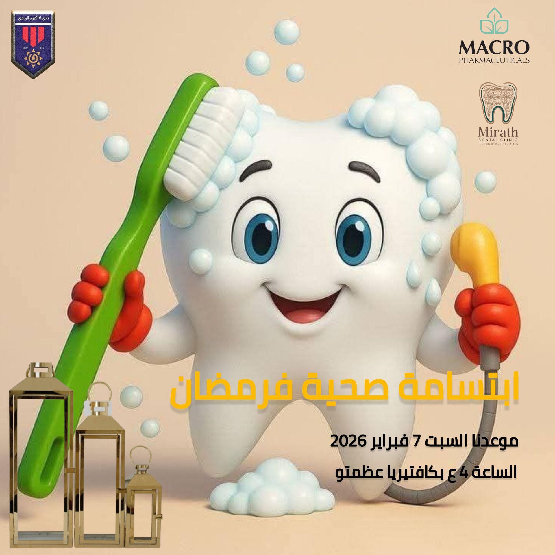 وبالتعاون مع عيادة ميراث للأسنان إيفينت: ابتسامة رمضان صحة وسعادة لكل الأسرة ✨ 📍 المكان: كافتيريا عظمتو 🗓 يوم السبت ⏰ من الساعة 4:00 إلى 6:00 مساءً 👶 أنشطة مجانية للأطفال 📚 فقرات توعوية عن التهيئة الصحية لرمضان لكل افراد الاسره معلومات شيقة وجديدة عن الحفاظ على صحة الأسنان نصائح مهمة للحفاظ على رائحة الفم في رمضان 🎁 وفي نهاية الإيفينت: *سحب على هدايا قيمه وخدمات طبيه مقدمة من عيادة ميراث للأسنان *هدايا مقدمه من شركه للمضمضه MACRO PHARMACALS لكل الحضور *وهدايا مقدمه من عياده ميراث لكل الاطفال نتمنى قضاء وقت ممتع للجميع وبالتعاون مع عيادة ميراث للأسنان